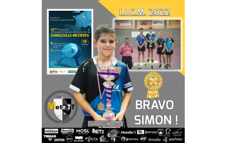 Un grand Bravo à Simon CLIN du Metz TT sous les couleurs du Grand Est, vainqueur des Internationaux Jeunes de Charleville-Mézières dans la catégorie des moins de 11 ans et se hisse en 8ème de finale dans les moins de 13 ans. Félicitations Simon