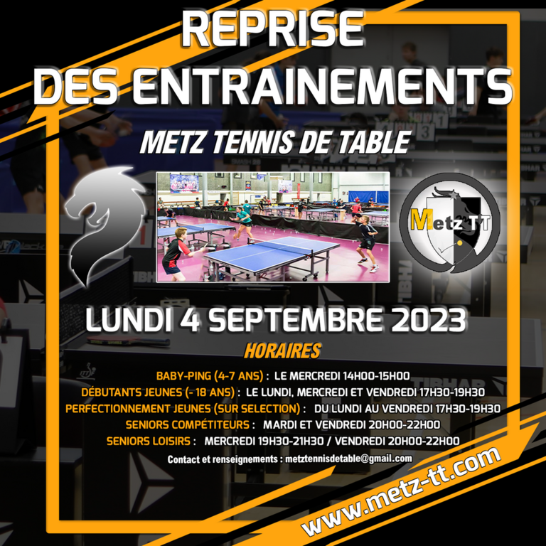 Les entraînements reprendront pour les membres licenciés de Metz Tennis de Table le lundi 04 septembre, marquant ainsi le début de la saison 2023-2024.