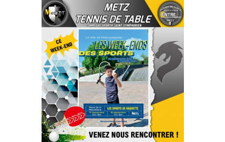 Le Metz Tennis de Table sera présent ce week-end, place de République à Metz pour l'animation "Les Week-ends des Sports". Venez nous découvrir sur le stand du Metz TT