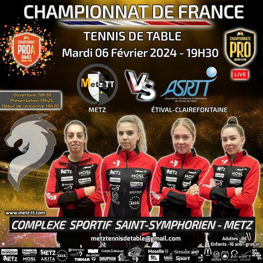 Les Filles du Metz TT reçoivent demain mardi 06 février à 19h30 le club de Etival-Clairefontaine au complexe sportif Saint-Symphorien pour le compte la 11ème journée du Championnat de France de Pro A Dames.