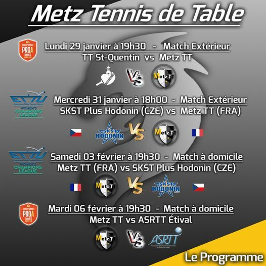 Samedi 03 février, 1/4 de finale retour de la Ligue des Champions face à Hodonín au complexe St Symphorien à Metz , rencontre à 19h30 avec retransmission sur Moselle TV et ETTU TV.