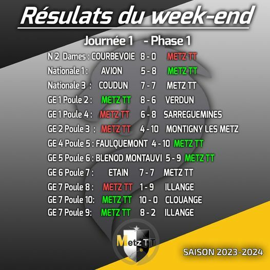 Voici les résultats de la 1ère journée de championnat de la phase 1 pour le Metz TT