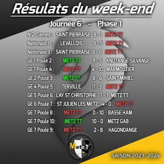 Voici les résultats de la 6 ème journée de championnat pour le Metz TT.