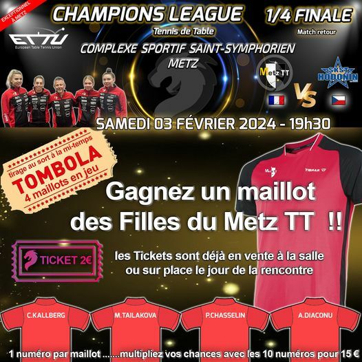 Participez à l'occasion de la rencontre de la Ligue des Champions du 3 février 2024 à 19h30 à notre tombola et gagnez un maillot des Filles du Metz Tennis de Table !
