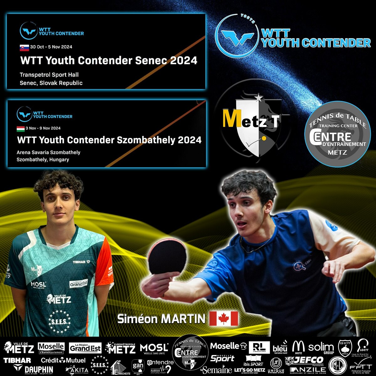 Grosse semaine pour Siméon Martin, joueur du Metz Tennis de Table et pensionnaire du centre d'entraînement. Notre Canadien préféré est en Slovaquie pour le WTT Youth Contender de Senec et enchaîne ensuite avec celui de Szombathely en Hongrie.