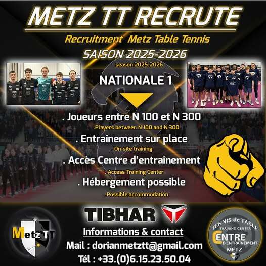 MetzTT recherche un joueur pour son équipe 1ère garçon en Nationale 1 pour la saison prochaine