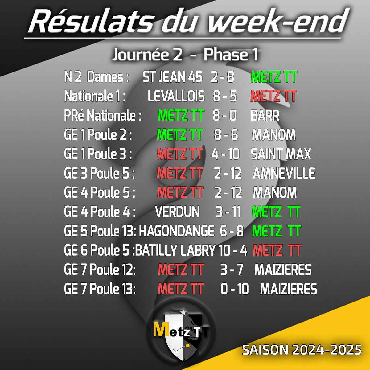 Voici les résultats de la 2ème journée de championnat de la 1ère phase pour le Metz TT