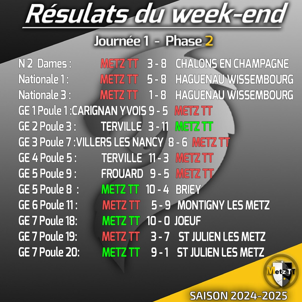 Voici les résultats de la 1ère journée de championnat de la 2ème phase pour le Metz TT