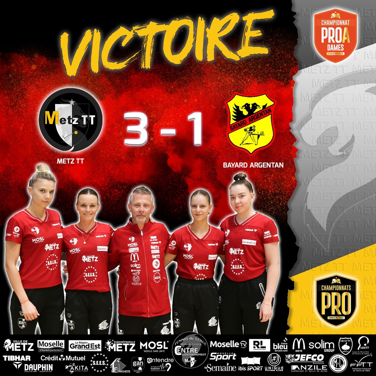 Victoire Victoire 3-1 pour le Metz TT face à Bayard Argentan lors de la rencontre d'hier soir au complexe sportif Saint Symphorien Bravo à toute l'équipe !