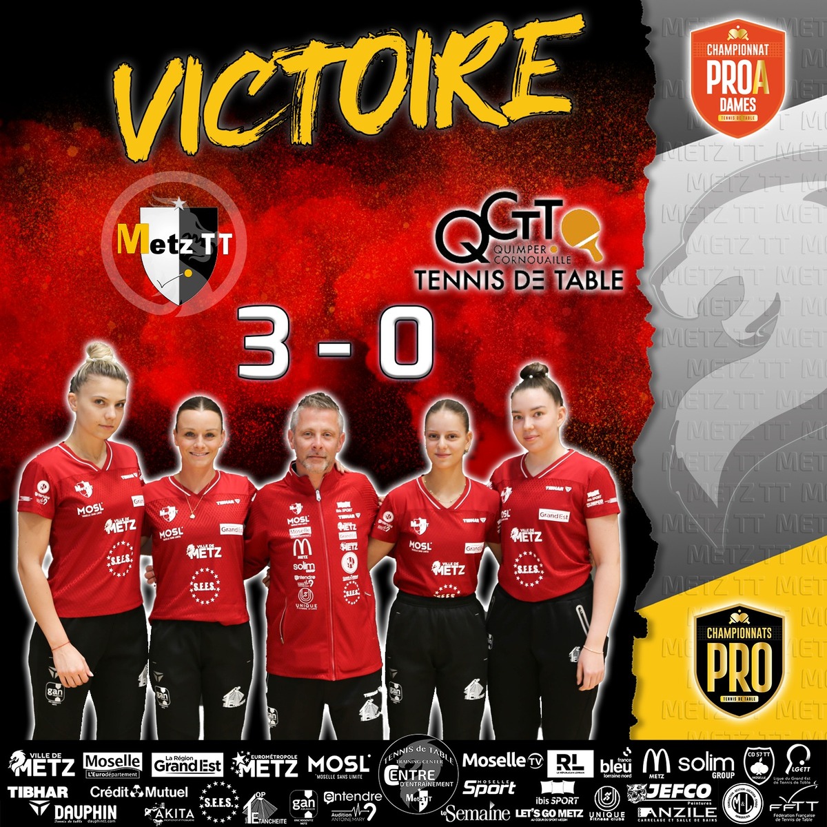 Hier soir, à l’occasion de leur troisième rencontre de la semaine, les filles du Metz Tennis de Table ont brillamment dominé l’équipe de Quimper Cornouaille, s’imposant par un score sans appel de 3-0.